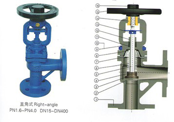 1.直角式截止閥的啟閉件是塞形的閥瓣,密封面呈平面,閥瓣沿流體的中心線作直線運動,介質流向為45°(低進高出)